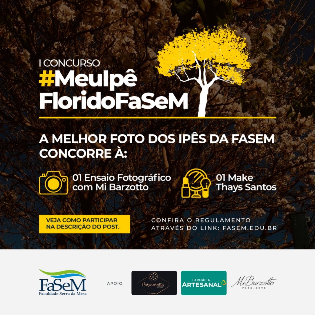 Pessoal, a Faculdade Serra da Mesa preparou para vocês um concurso de fotografia. O tema proposto será sobre Ipês da FaSeM, o evento será em parceria com a Fotografa Michelle Barzotto, a Makeup Thays Santos e a Líder Coach Ana Paula Sasaki.