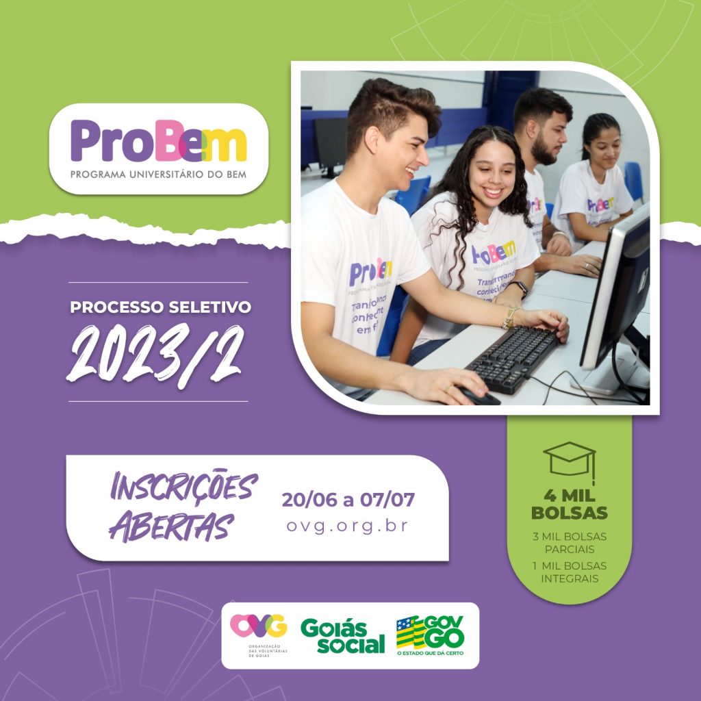 O Programa Universitário do Bem (ProBem) está com edital aberto para 4.000 (quatro mil) novas bolsas oferecidas para estudantes universitários em situação de vulnerabilidade social de todos os 246 municípios goianos. As inscrições iniciaram em 20 de junho e vão até 07 de julho. Para participar, o candidato precisa: