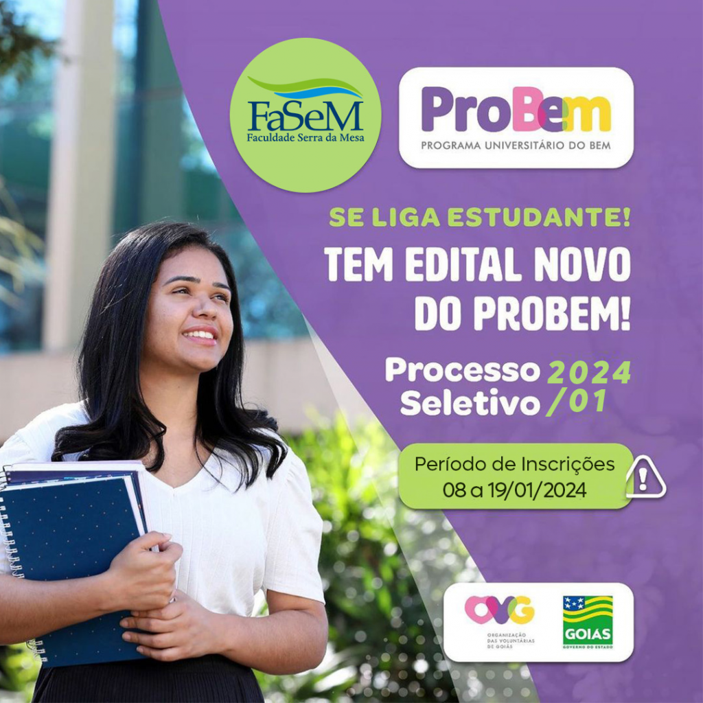 O Programa Universitário do Bem (ProBem) está com edital aberto para 4.000 (quatro mil) novas bolsas oferecidas para estudantes universitários em situação de vulnerabilidade social de todos os 246 municípios goianos. As inscrições iniciam em 08/01/2024 e vão até 19/01/2024. Para participar, o candidato precisa: