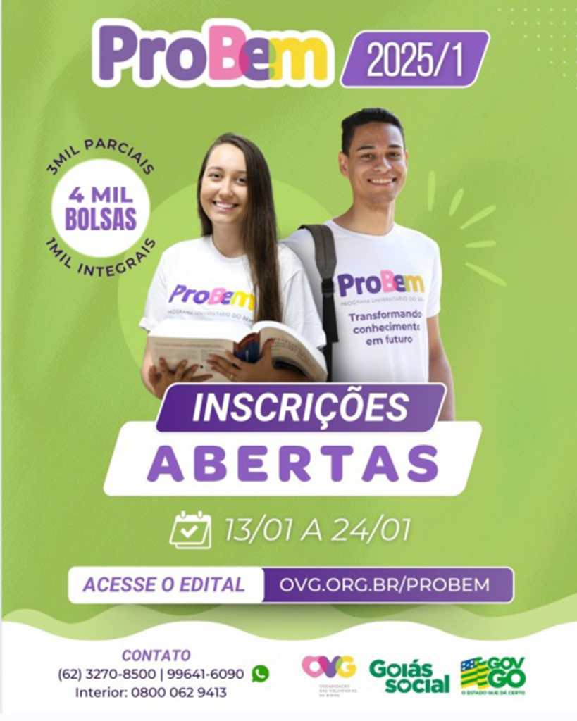 O Programa Universitário do Bem (ProBem) está com edital aberto para 4.000 (quatro mil) novas bolsas oferecidas para estudantes universitários em situação de vulnerabilidade social de todos os 246 municípios goianos. As inscrições iniciam em 13/01/2025 e vão até 24/01/2025. Para participar, o candidato precisa: