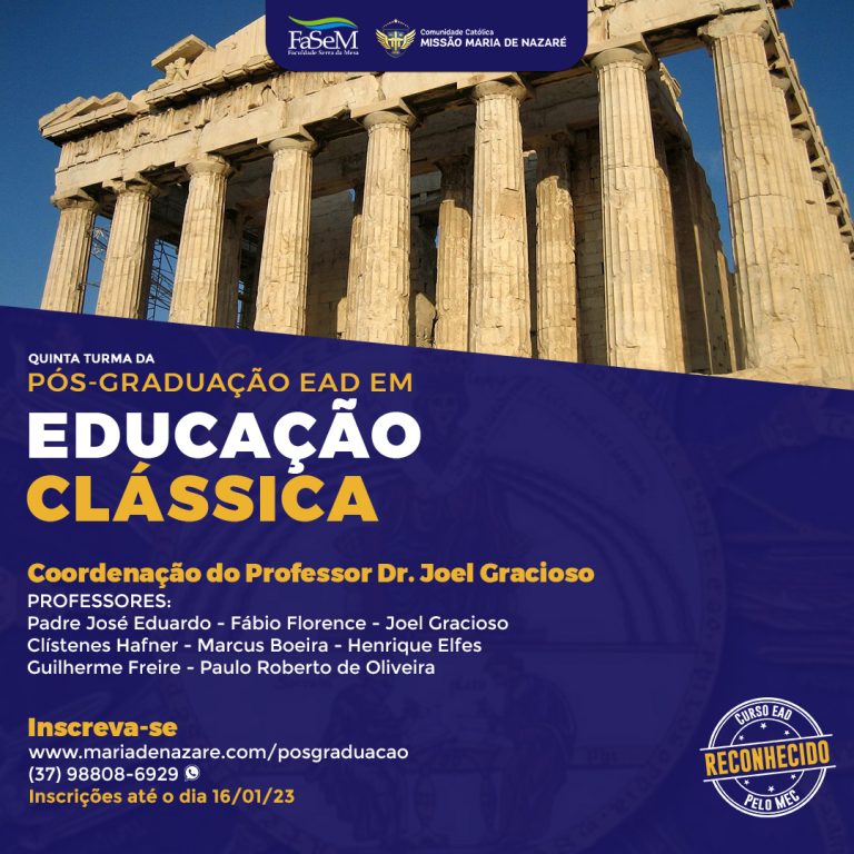 Informamos que o resultado Definitivo do processo seletivo da Pós-Graduação em Educação Clássica (V Turma), já está disponível. Para acessar, basta entrar na página Educação Clássica – Pós-Graduação FaSeM, no menu Processo Seletivo e submenu Resultado.