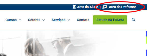 01 – Primeiramente acesse a área do professor: no site da instituição, localize “Área do Professor” no canto superior direito. Nesta página você tem acesso ao “Portal do Professor – SEI”.