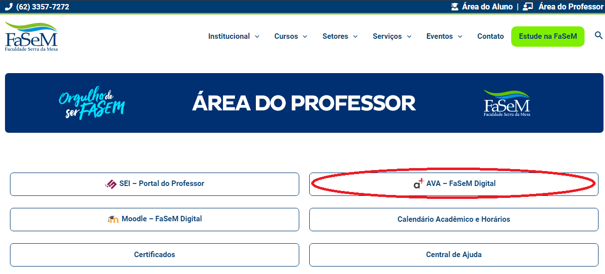 03 – Siga o passo 01 da guia anterior para acessar a Área do Professor, nesta página você tem acesso ao “AVA – FaSeM/UniSeM Digital” (Plataforma A), a plataforma mais recente para professores dos cursos de Graduação e Técnico.